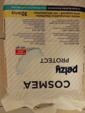 Hygieneeinlagen bzw. Saugvorlagen für Frauen nach der Geburt oder bei leichter Inkontinenz, neu, ungeöffnet, 30 Stück 6,- wasserdichte Bettunterlagen 60x90cm, 9 Stück Packung bereits geöffnet 5,- 7 Stück Netzunterhosen und 7 Saugvorlagen für Frauen nach der Geburt 2,-