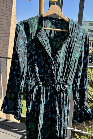 Stylisches modernes Kleid von Baumgarten und Pferd, Viskose, kein Bügeln!, Größe 38 40, neuwertig, NP 300 , für günstige 40 an modebewusste Dame, super Tragekonfort, Länge bis halbe Wade (bei 168cm), seitlich Schlitze, Raffung unter Brust und am Ärmel selbst mit Kordeln regulierbar.