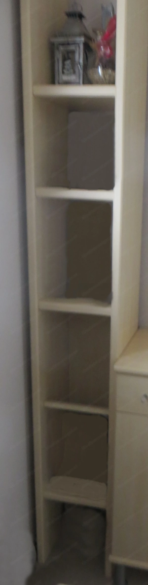 guterhaltene Garderobe hoher Schuhschrank mit Spiegel und Einlegeböden Kleiderstange Schmales offenes Regal (alles die gleiche Farbe, ist nur wegen dem Lichteinfall)