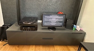 TV Sideboard in Eiche vom Tischler Maße: 210 x 45,5 x 50 Rückwand weiß lackiert 3 Schubladen per Tip Open Kabelkanal Fach für allerlei Geräte Auf Rollen Selbstabholung (Achtung: schwer!)