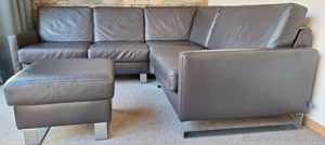 Ledergarnitur Marke Ewald Schillig. Bezug Dickleder in Farbe Espresso. Maße 218cm x 198 cm, Hocker 55cm x55 cm. Armlehne außen, Kufen Edelstahl.