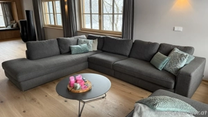 Ecksofa Stoff in Grau. Masse 330cm x 260cm (Chaise Longe), Tiefe 100cm. Mit Hocker 100cm x 100cm. Marke ist Ditre Italia Amiata.