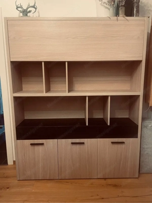 Ich verkaufe einen modernen Büroschrank in schöner Holzoptik mit schwarzen Schubladen. Details: Breite: 148,5 cm Höhe: 186,5 cm Tiefe: 35 cm Zustand: wie neu Der Schrank bietet viel Stauraum und passt ideal ins Büro, Arbeitszimmer oder Homeoffice. Nur Abholung. Bei Interesse gerne melden!