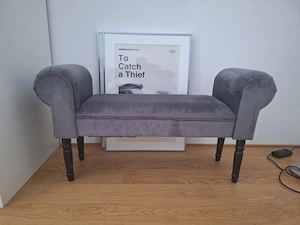 Wegen Umzug abzugeben: Ablage- oder Bettbank mit den Abmessungen: Breite 102cm, Höhe über alles 54cm, Tiefe 30cm. Stoff: Samt mittelgrau; Beine: schwarzes Holz. Wie NEU, keine Flecken, Löcher oder Abnutzungen. Ideal, um Kleidung im Schlafzimmer oder im Eingangsbereich abzulegen. Sieht sehr edel ...