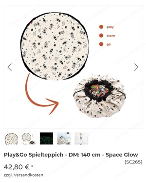 Praktische Play&Go Spielteppich aus cremefarbenem Canvas mit einem schön Weltraummotiv auf der Außenseite. Es gibt sie auch mit coolen leuchtende. Der Play&Go -Spielteppich ist ein großes, rundes Stück Stoff mit einem umlaufenden Kordelzug aus schwarzem Garn. So lässt er sich zu einer Beutel Schnürsenkeln. ...