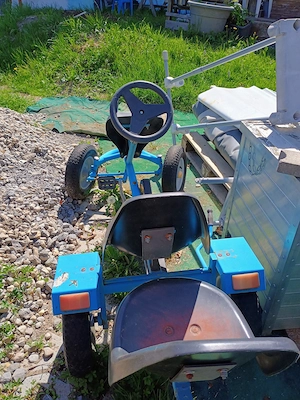 Anhängerkupplung vorne und hinten, Anhänger, Kniemulde, Lenkrad mit Hupe sowie Tankdeckel. Der Bobby Car ist gebraucht und in sehr gutem Zustand.