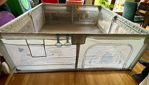 Verkaufen ein Laufgitter mit den Maßen 100x100cm, es ist rollbar (mit Bremse), zusammen klappbar und höhenverstellbar, inkl. Matratze und Auflage Gitterschutz, drei Stäbe lassen sich entnehmen, sodass das Kind auch selbstständig hinein und heraus könnte.
