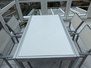 Ausziehbarer Terrassen- Gartentisch gebraucht, sehr guter Zustand L 143 cm, B 92 cm (6 Personen) sehr einfach ausziehbar auf 286 cm Länge (10 Personen) Rostfreies Aluminiumgestell und weiße, sehr robuste Tischplatte für den Außenbereich; 4 Gartenstühle, stapelbar gibt es gratis dazu!