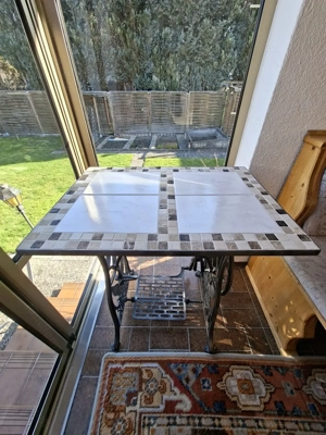 Schöne alte Nähmaschine zu einem Tisch umgewandelt. Toller Belag aus Fliesen, sehr robust Masse: 65 x 45 cm, Hhe 74 cm Standort für Besichtigung wäre in Götzis