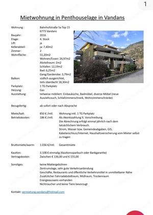 Wohnung in Vandans ab 01.05.2026 zu vermieten. In ruhiger Lage von Vandans wird diese gemütliche 53 m EG-Wohnung ab 1 Mai 2026 vermietet. Details zur Wohnung : Wohnfläche 53 m , Eigener Hauseingang, Wohnküche, 1 Schlafzimmer, Dusche WC , 1 Abstellraum, Terrasse, 1 Parkplatz Keine Haustiere ...