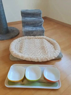 Verkaufe Kratzbaum Starterset. Inkl. Katzenstiege mit Decken und Futterschüssel. Kratzbaum Höhe 90 cm Liegefläche Durchmesser 45